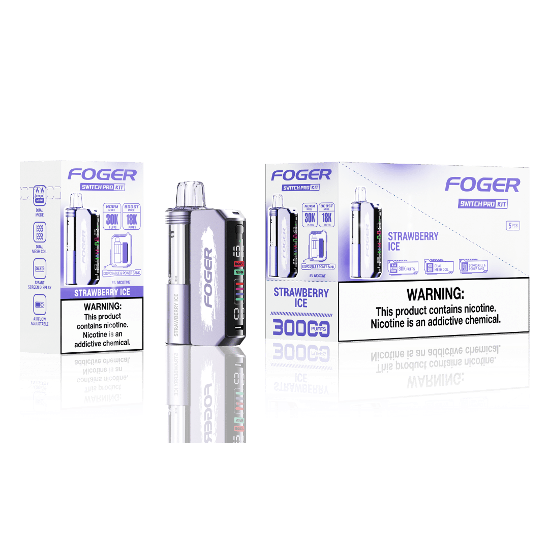 Discover unmatched convenience with the Foger Switch Pro Kit, featuring a detachable vape, dual mesh coils, and a see-through tank. Enjoy up to 30,000 puffs in Normal Mode or 18,000 puffs in Boost Mode with its built-in 200mAh battery and included 850mAh power bank. A full color smart screen, adjustable airflow, and USB C fast charging ensure a premium, customizable vaping experience. 5% strength, eco friendly, and pod replaceable for long term use.